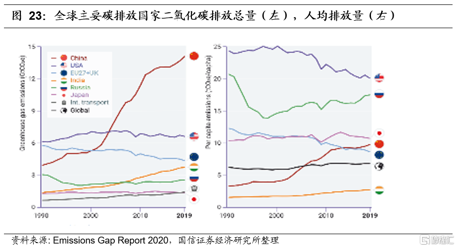 中、欧、美是碳排放最大经济体,三者温室气体排放全球合计占比达52%。中国是全球第一大碳排放经济体,温室气体排放量占比超25%,人均排放量比全球平均水平高约40%;美国温室气体排放量占全球排放量13%,其人均排放量为仍全球最高(全球平均水平三倍),近10年总体保持下降趋势,主要是由于能源需求的增加推动能源结构逐渐从煤炭转向天然气和可再生能源转变;欧盟(欧盟+英国)温室气体排放量全球占比8.6%。随欧洲碳排放交易体系(EU-ETS)的实施和推动,欧洲过去几年碳排放保持稳定下降趋势。此外,印度、俄罗斯和日本的温室气体全球占比分别为7.1%、4.9%和2.7%。