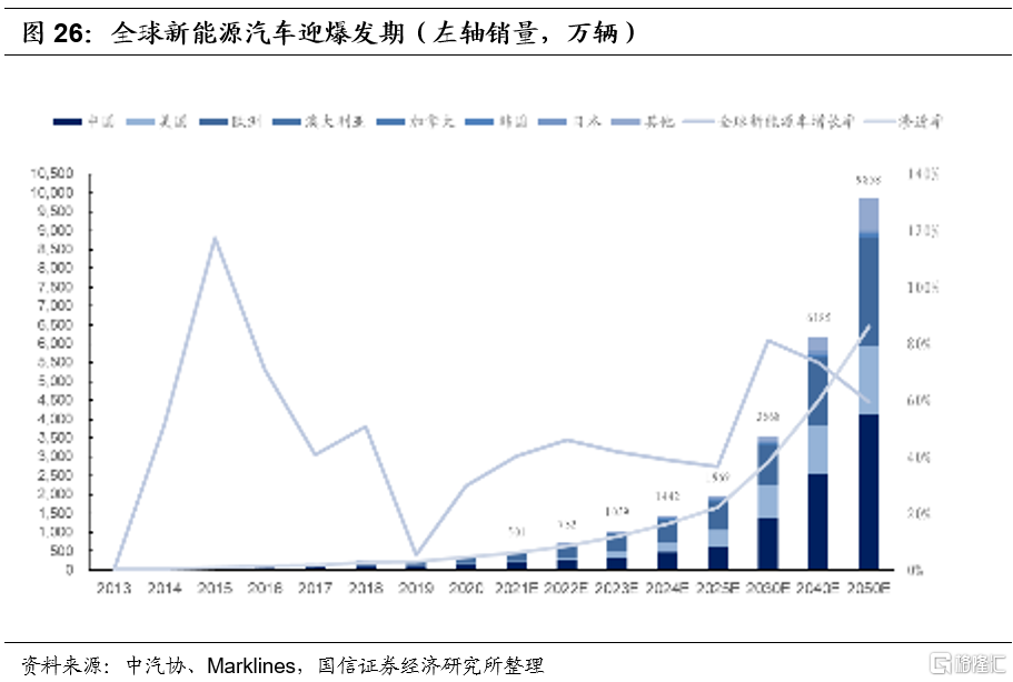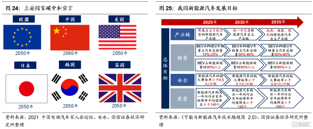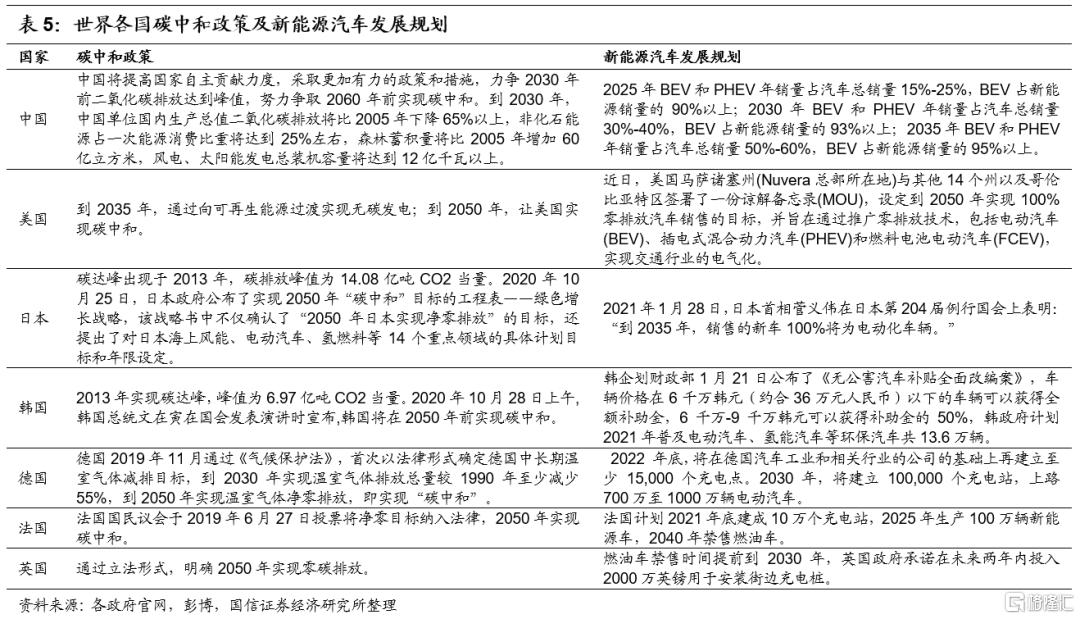碳中和成全球共识,各国纷纷明确碳中和目标,并提出禁售燃油车时间。中国2030年碳达峰、2060碳中和目标,并明确表示2025年BEV和PHEV年销量占汽车总销量15%-25%,BEV占新能源销量的90%以上;欧洲提升2030年原定减排目标,2050年实现碳中和(其中德国计划最晚2050 年实现碳中和,英国 2030 年将禁售燃油车,法国2040年禁售燃油车);美国拜登方提出2050年实现零排放,并设定到2050年实现100%零排放汽车销售的目标。