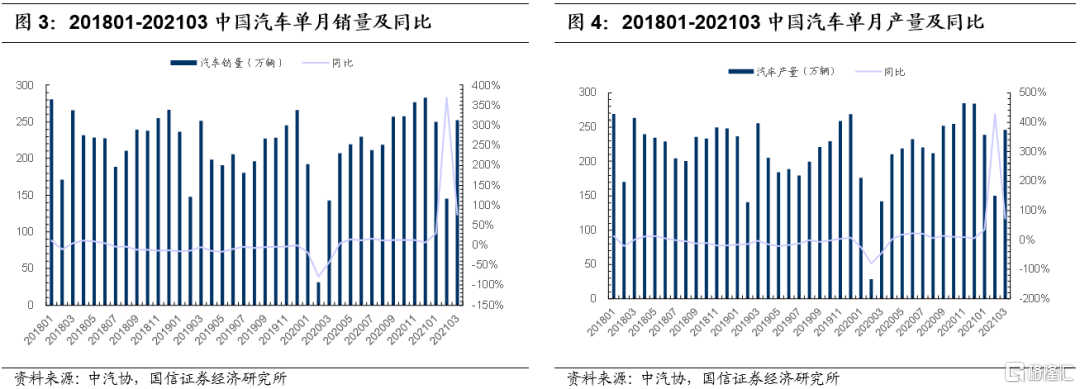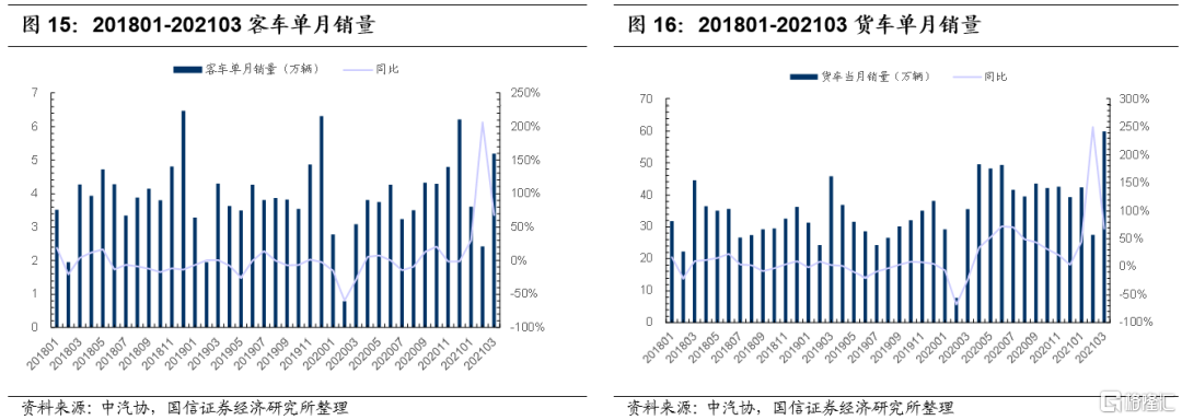根据中汽协的数据,2021年1-3月,乘用车销量分别为205/116/187万辆,分别同比+27%/+416%/+80%;产量分别为191/116/118万辆,分别同比+33%/+496%/+80%。2021Q1乘用车累计销量为508万辆,同比+77%,环比-25%;乘用车累计产量为496万辆,同比+85%,环比-27%。乘用车行业增速及复苏进程基本与汽车行业同步。