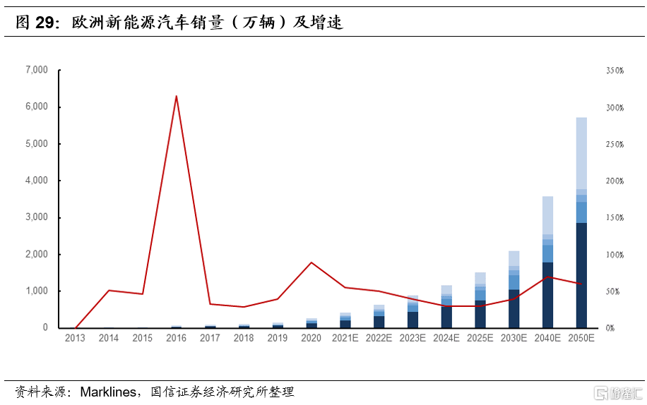 2)结构方面,欧洲新能源车消费进一步向纯电倾斜。近几年纯电在新能源汽车中的销量占比长期维持在50%左右水平,由2018年的54%上升至2019的64%,纯电渗透率由2018年的2.6%上升至2019年的3.3%。2020年,纯电车型占比车市总比重6.2%,插电混动车型占比4.8%。从政策更为鼓励纯电以及车企规划的纯电新车型数量远高于插混的情况来看,纯电占比大概率进一步上行,2025年渗透率有望达20%。