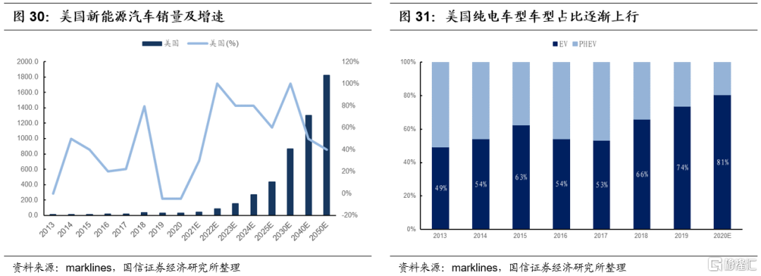 2)结构方面,纯电占比逐渐上升。2013-2017年美国新能源汽车结构中纯电与插混各占据半壁江山,2018年随特斯拉纯电车型上行,纯电占比逐渐上升,从2018年的66%上涨到2020年的81%,有望持续上行。