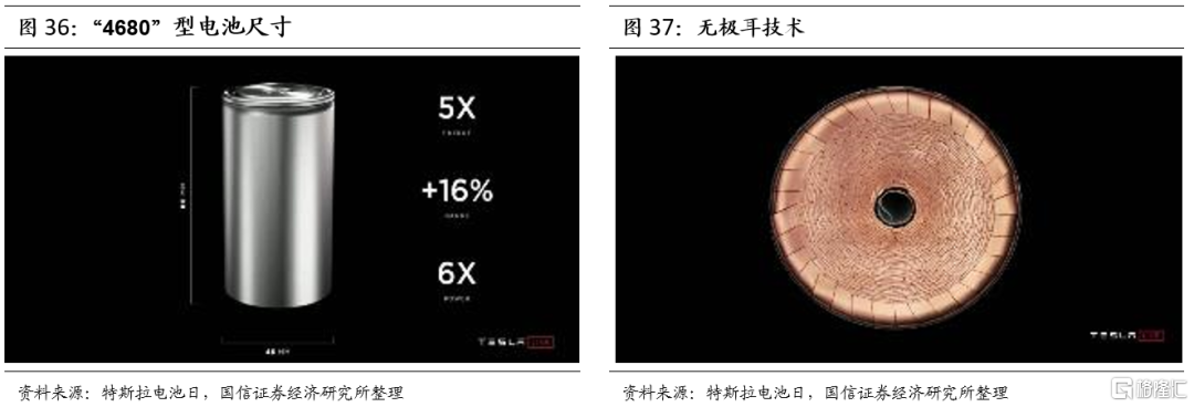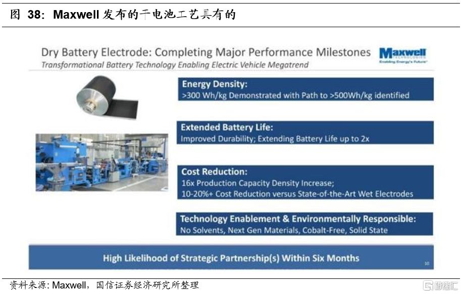 首先,公司从电极设计开始做创新,采用干电极工艺;此工艺来源于此前被公司收购的Maxwell,符合我们在《国信证券-汽车行业专题-特斯拉系列之十二:特斯拉电动化技术源分析》中的预测。