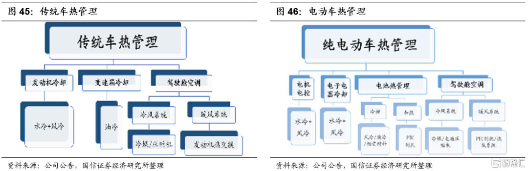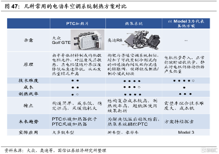 (2)汽车空调:对于制冷,新能源车与传统车原理相近,差异在两点,一是传统车压缩机可由发动机驱动,而电动车由于动力源变为电池需使用电动压缩机;二是联结方案上,传统车动力系统与空调制冷过程较独立,而电动车电池与空调冷却系统通常联结。对于制热,传统车空调系统加热借助发动机的余热,电动车需借助PTC加热(冬季使用续航受较大影响),未来制热效率更高的热泵系统是趋势。
