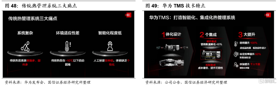 热泵技术持续升级。传统热泵方案系统复杂、管路众多,环境适应性差(在-10℃以下无法使用),智能化程度低(标定等工作依靠人工),严重影响了热泵系统的效率和应用。华为针对当下痛点推出业界集成度最高的智能汽车热管理解决方案。华为针对传统热管理系统1)系统复杂(管路多、部件多);2)环境适应性差(-10度以下启动困难);3)效率和智能化程度低、体验缺乏个性化的三大痛点。历经四年时间研究与开发,推出华为TMS。华为TMS通过一体化设计、部件和控制两个集成,可以实现能效、标定效率、体验三大提升,解决了传统热管理的痛点问题。