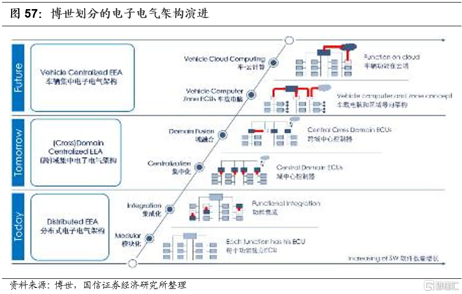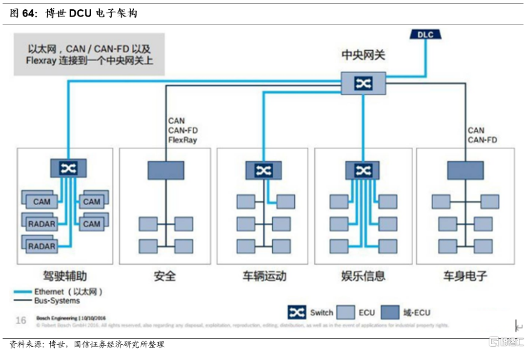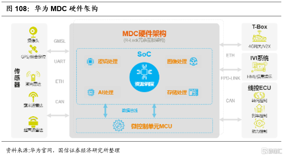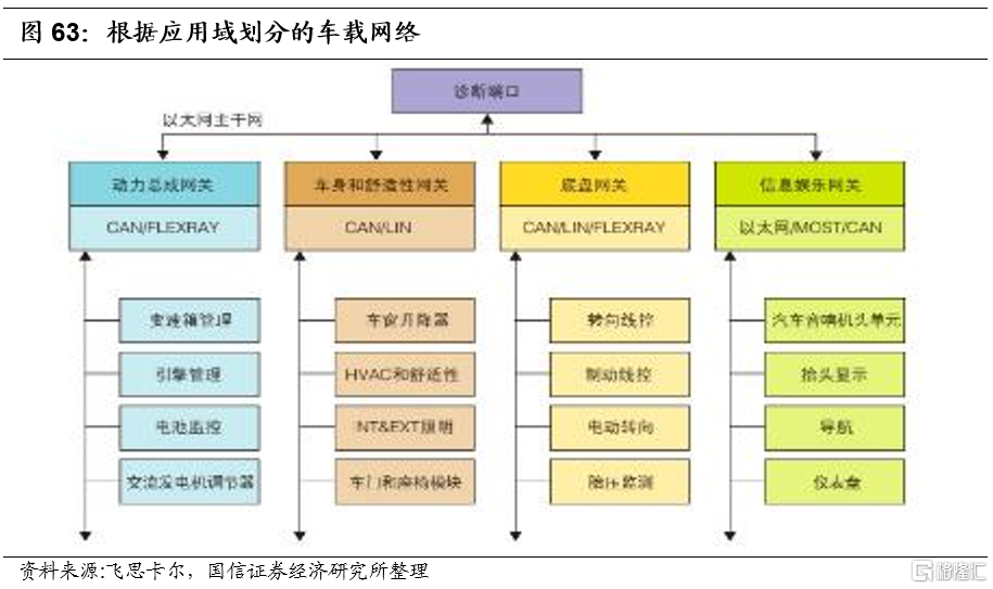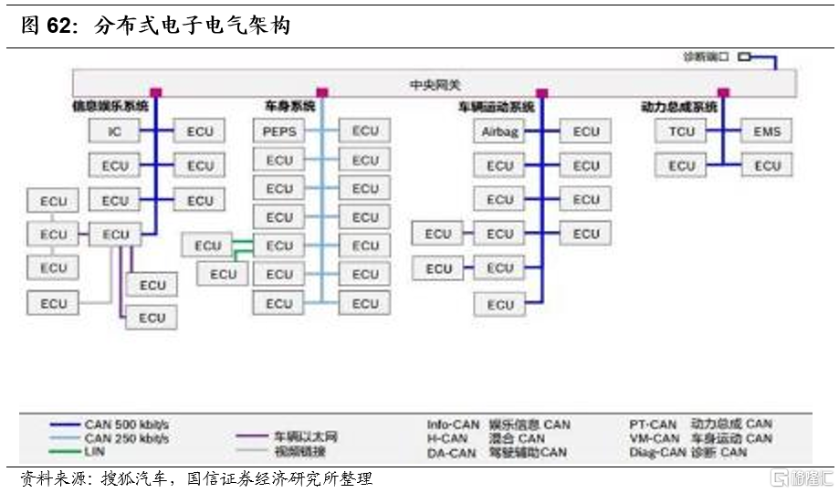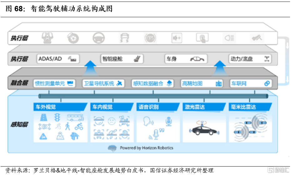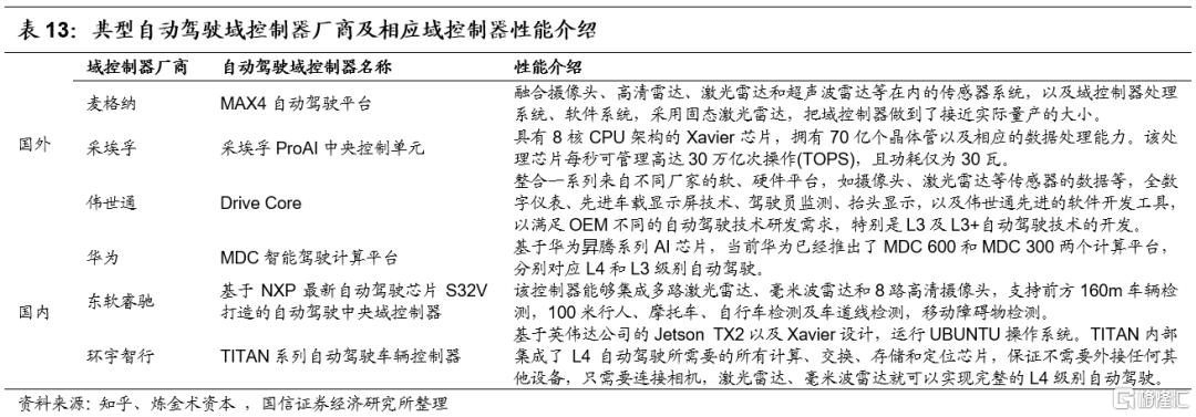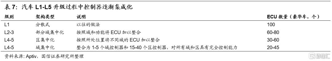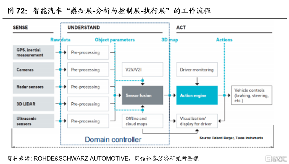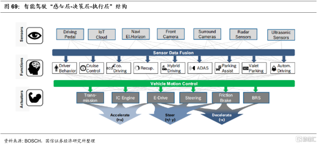 运动端:汽车EE架构整合了各类传感器、ECU和线束拓扑等电气分配系统。分布式EE架构主要用于智能驾驶L2级别以下车型;从L3级别开始,集中式的域控制器走上舞台。智能驾驶域控制器是汽车的大脑,基于高算力芯片迭代无人驾驶算法,感知-决策-执行并行实现汽车运动端革命。