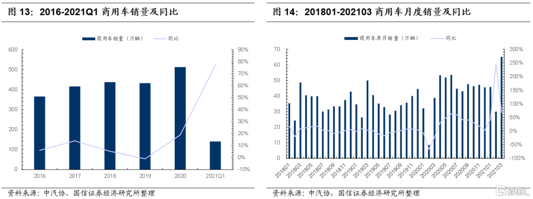 货车:根据中汽协的数据,2021年1-3月,国内货车销量分别为42/27/60万辆,同比+44%/+250%/+68%。2021Q1国内货车累计销量130万辆,同比+78%,环比+5%。货车受重卡治超、经济复苏带来运力需求增加、皮卡进程等政策刺激,增速总体优于商用车行业。