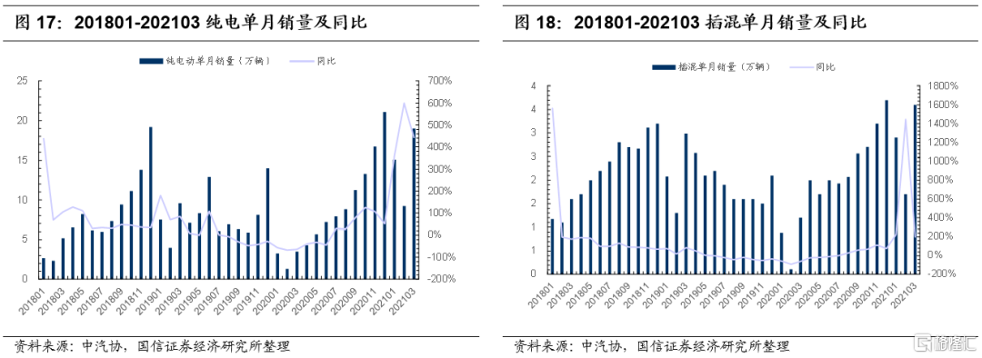 纯电动:根据中汽协的数据,2021年1-3月,纯电动汽车汽车销量分别为15/9/19万辆,分别同比+362%/600%/443%。2021Q1累计销量为43万辆,同比+436%,环比-15%。纯电动汽车销量同比增速远远优于汽车行业及新能源汽车行业的平均增速,领跑行业。
