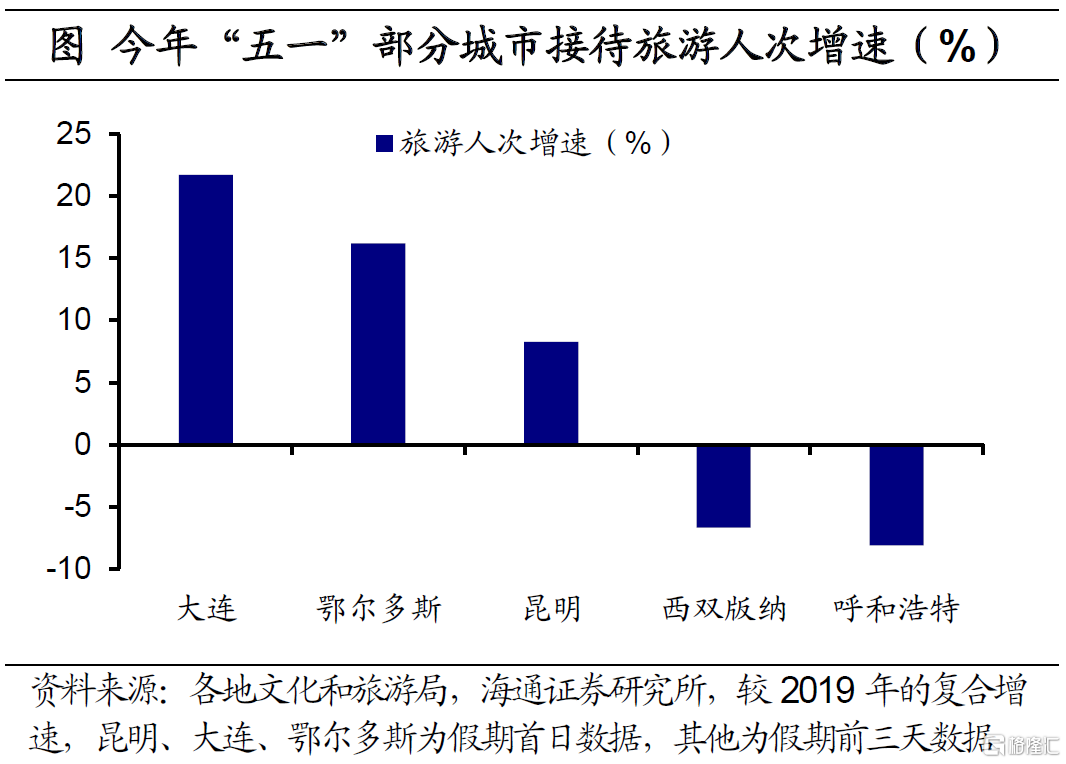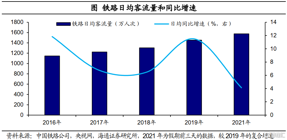 从出行人次来看,根据中国铁路公司发布的数据,今年“五一”假期前三天,铁路日均客流量达到1576.3万人次,相比2019年增长8.4%,两年平均增长4.1%,但是相比201911.5%的增速仍有一定差距。