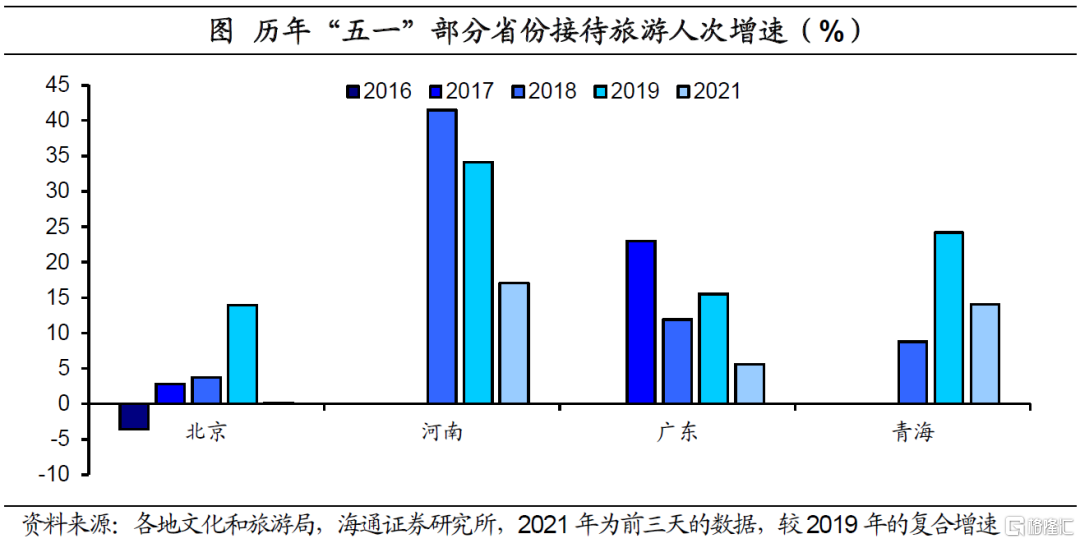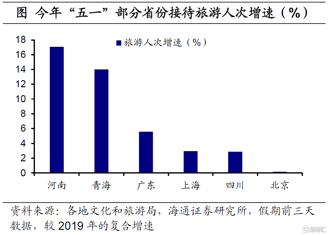 从游客接待量来看,以广东为例,今年“五一”假期前三天,广东接待游客755.3万人次,较2019年增长11.5%,两年平均增长5.6%,不仅远不及201915.5%的增速,还与2018年有着明显差距。此外,北京、河南、青海等地区也是类似的情况。