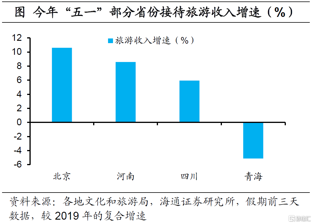 旅游收入的恢复或仍然慢于旅游人数的恢复。例如,河南、青海的旅游人次相比疫情前有明显的回升。但是,河南的旅游收入增速明显低于旅游人次增长,青海的旅游收入还未恢复到疫情前的水平。这说明旅游的恢复存在分化特征,且旅游收入恢复慢于旅游人数。