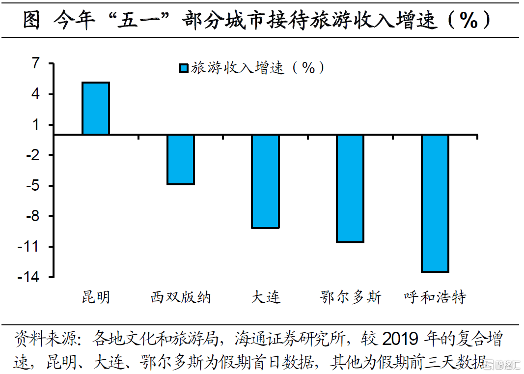 在假期前三天,从绝对量来看,多个地区旅游人次和旅游收入已经恢复到了疫情前的水平。但是从增速来看,五一期间消费或与往年相比仍有一定的差距。我们认为,这主要与人口流动仍然受影响、假期景区疫情防控等因素有关。在文娱方面,票房日均收入3.9亿元,相比2019年增长2.9%,但是与2019年的增速13.4%有着明显差距。所以消费仍然没有完全回到疫情之前的增长轨道,仍是本轮经济恢复的薄弱环节,未来或延续弱复苏的态势。
