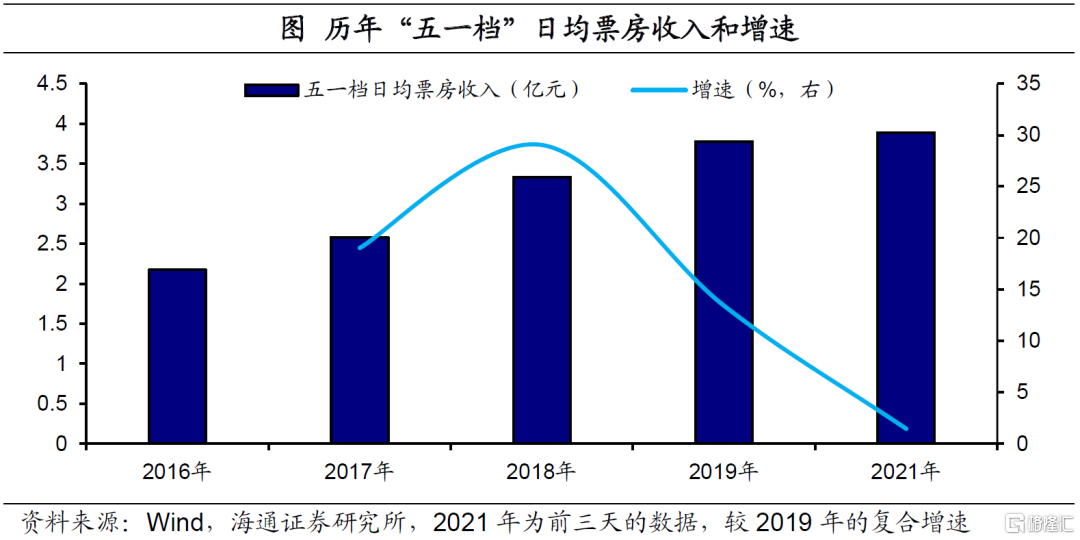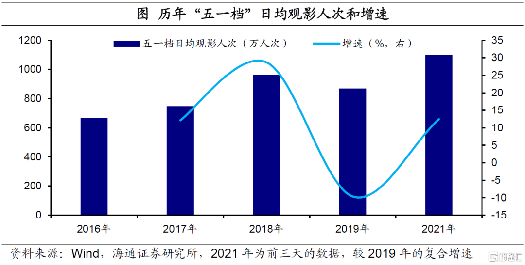 2021五一假期前三天,日均观影人次1100.8万人,相比2019年增长26.5%,两年平均增长12.5%。从票房情况看,假期前三天日均收入3.9亿元,相比2019年增长2.9%,两年平均增长1.4%,但是与2019年的增速13.4%有着明显差距。