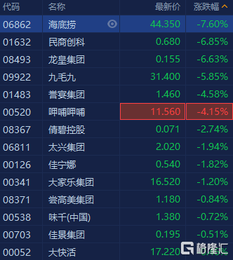 港股异动丨餐饮股大跌 海底捞(6862.HK)重挫7.5%创阶段新低