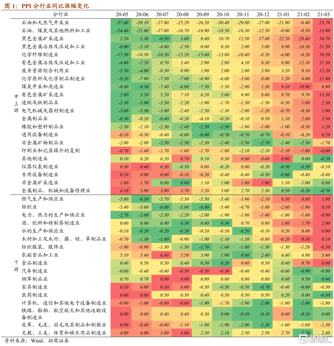 图1:PPI分行业的扩散体系。从PPI分行业的同比涨幅变化来看,截至2021年3月,77%的中上游行业价格涨幅较起点位置明显扩大,尤其是石油、黑色、化工、有色等行业最为突出;53%的下游行业价格涨幅也出现扩大,其中水电气与纺织业等受能源价格影响较大的行业最为突出,体现了中上游价格对下游的传导,只是下游的价格弹性不及中上游。