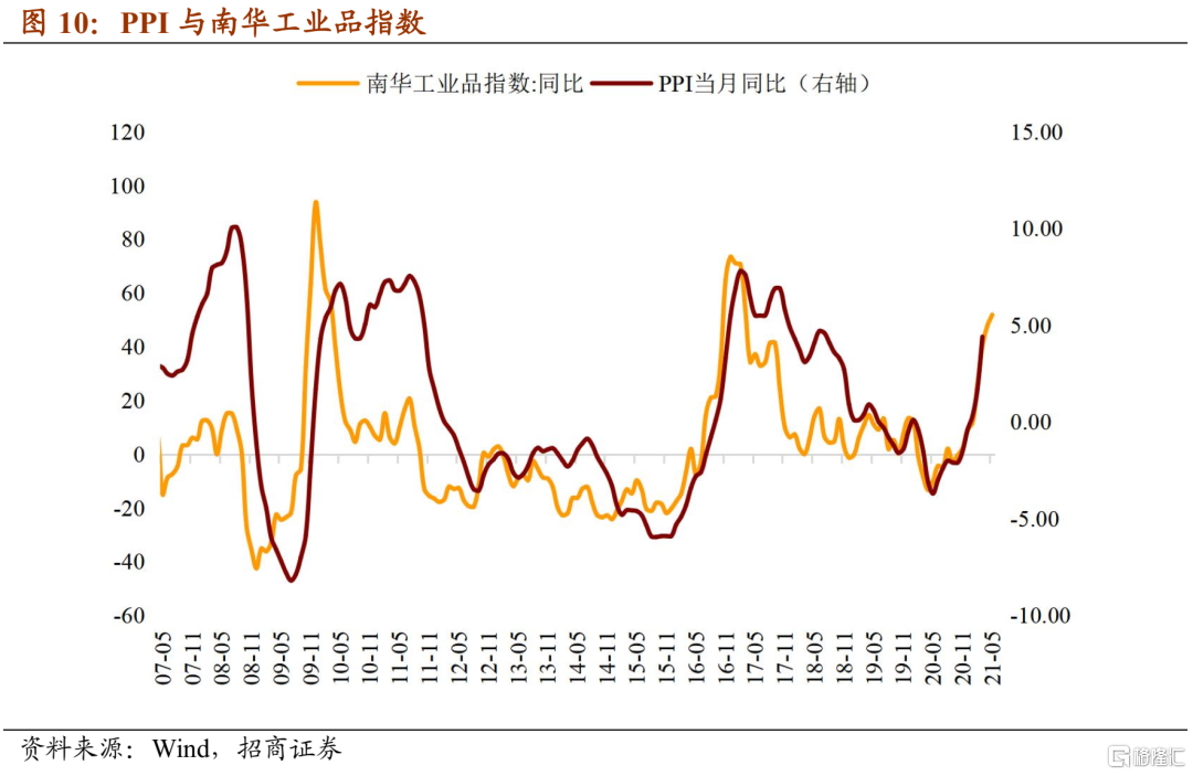 图10:PPI与南华工业品指数。南华商品指数是南华期货发布的日频数据,与CRB现货指数不同,南华商品指数是基于期货市场的价格指数。它选择三大交易所上市品种中代表性较强且具有较好流动性的商品来编制,涵盖工业品、农产品、金属、贵金属、能化等几大类。南华工业品指数即为其中一类,2020年6月1日最新调整后,主要权重构成为原油(18.94%)、螺纹钢(12.66%)、铁矿石(10.16%)、铜(9.28%)等。