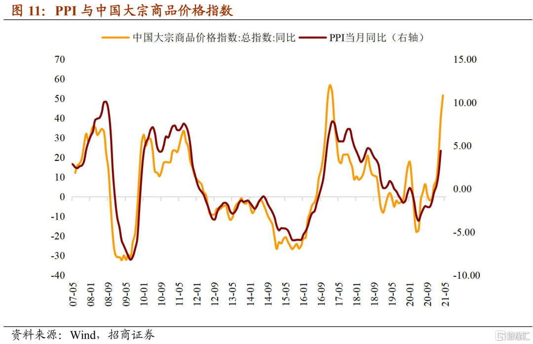 图11:PPI与中国大宗商品价格指数。中国大宗商品价格指数是商务部发布的周频数据,发布于商务部公共信息服务平台“商务预报网”。它是依托中国国际电子商务中心大宗商品现货价格周度数据库,以2006年6月为基期利用加权平均法计算的定基指数,涵盖了能源、钢铁、矿产品、有色金属、橡胶、农产品、牲畜、油料油脂、食糖等9大类别26种商品。
