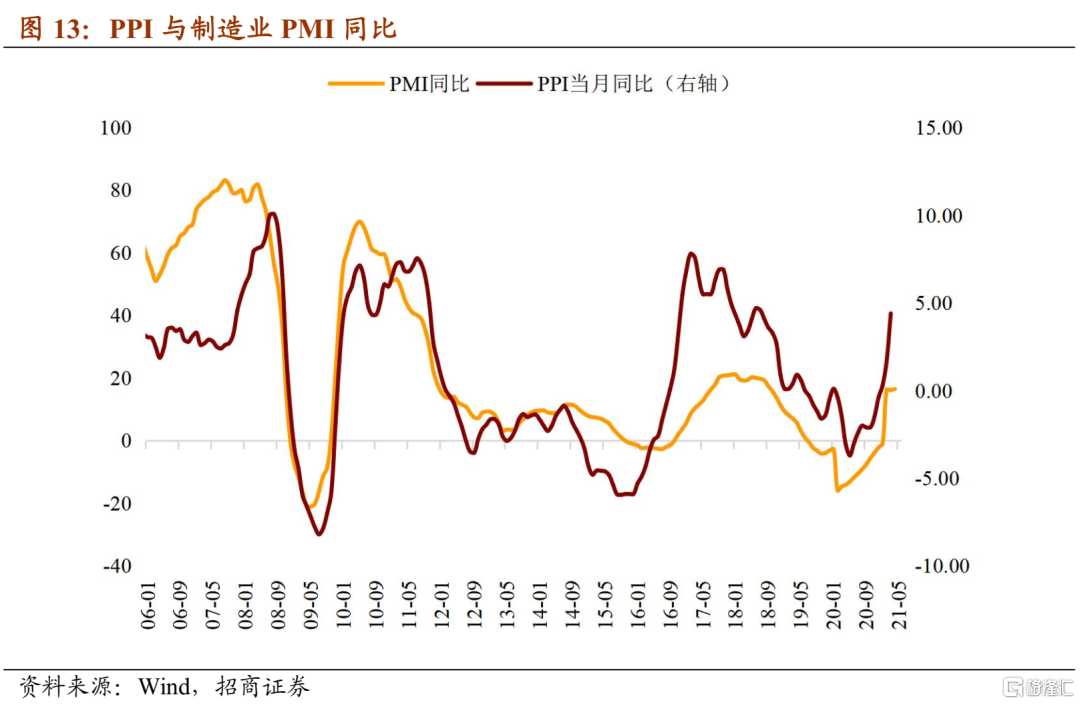 图13:PPI与制造业PMI同比走势一致。制造业PMI是统计局发布的反映经济景气程度的指标,按照环比连乘法将其转化为同比指标,更能反映经济趋势,与PPI走势一致。