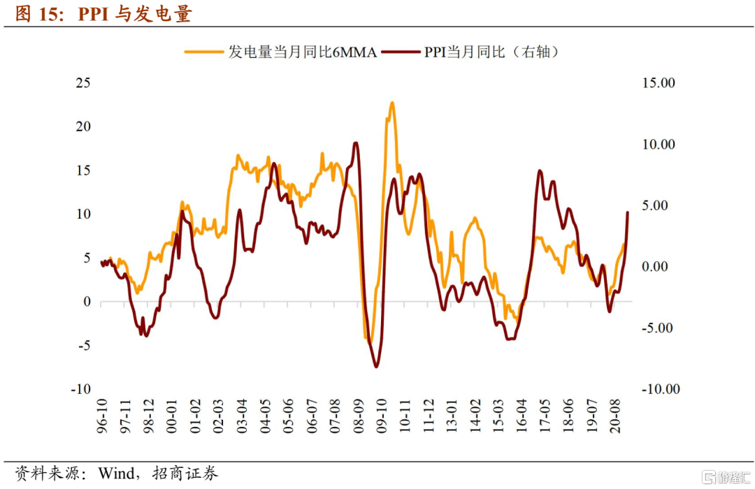 图15:PPI与发电量走势一致。从我国用电结构来看,以21年前3个月数据为例,城乡居民用电量占全社会用电量的15.9%,其余为产业用电,且一二三产用电量占比分别为1.1%、65.7%和17.3%,即主要是工业用电。因此,发用电量数据能够反映工业运行情况,该指标与PPI走势一致。