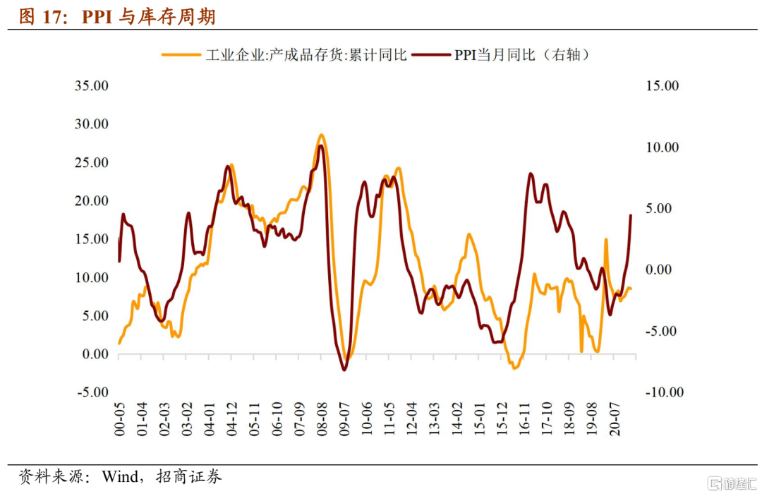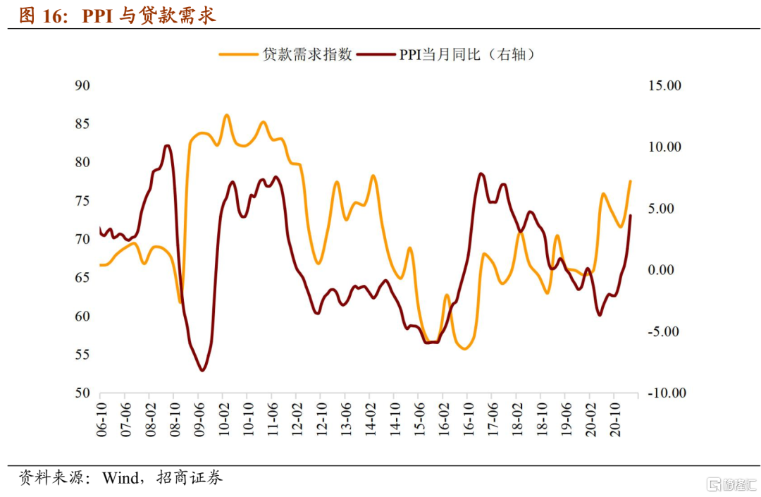 图16:PPI与贷款需求走势一致。贷款需求指数是央行通过季度问卷调查统计得到的,一般而言,宏观经济越好,企业贷款需求越旺盛,该指标与PPI走势一致。