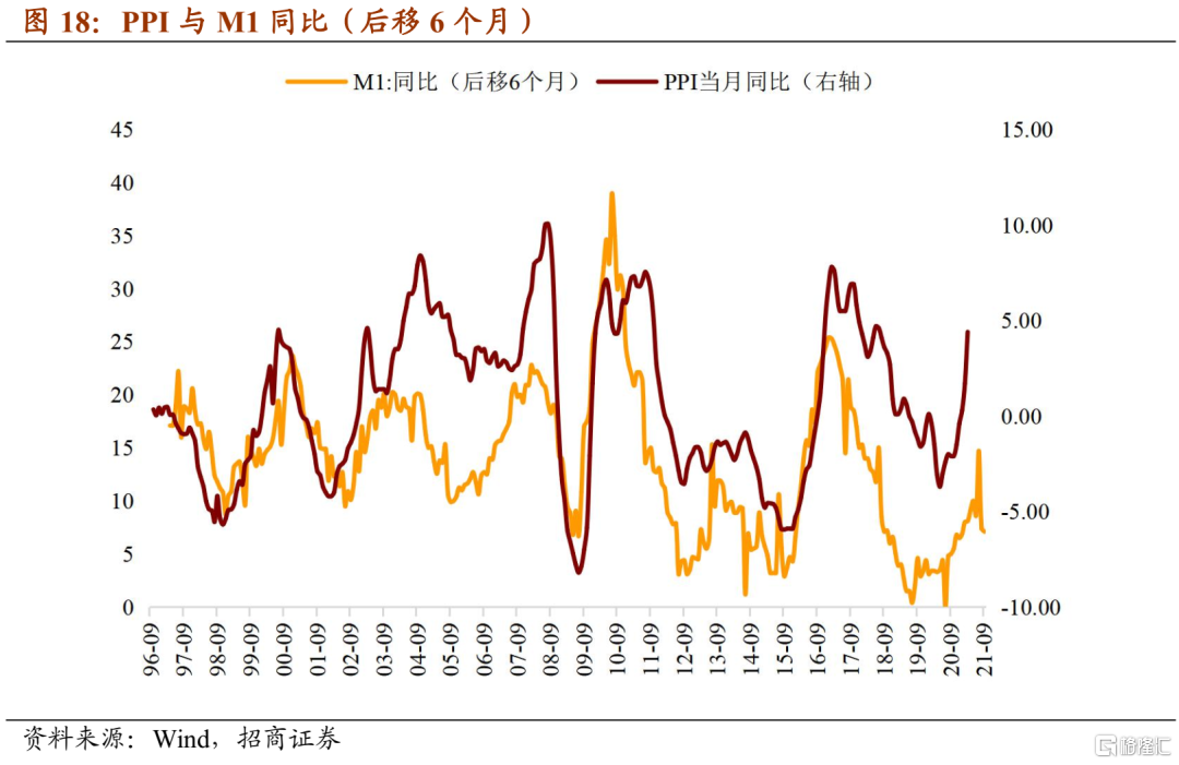 图18:PPI是M1同比的滞后变量。历史上,M1对PPI有着相对稳定的领先关系:M1领先PPI在2-3个季度。比如,金融危机以来M1的三次趋势性拐点分别是09年1月、12年1月和15年3月,对应PPI的三次拐点分别是09年7月、12年9月和15年12月,时滞分别为6个月、8个月和9个月。这是因为M1主要是企业活期存款,M1同比上行对应着企业经营情况改善,实体经济向好,是PPI上涨的内生性因素。目前看,若M1不掉头,PPI难下行。