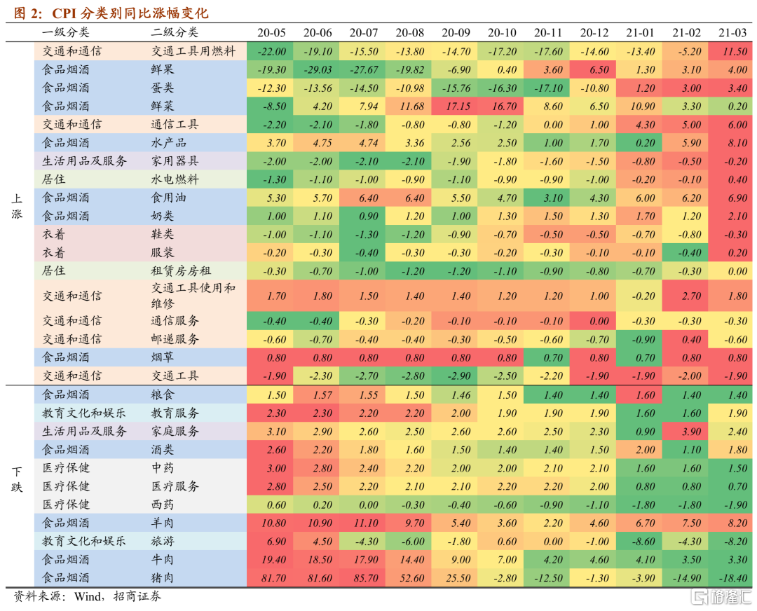图2:CPI分类别的扩散体系。从CPI分类别的同比涨幅变化来看,以上同一时间段内,价格涨幅扩大最为突出的有两类,第一类是交通通信项下的“交通工具用燃料”,直接体现了能源价格上涨对CPI能源项的传导;第二类是食品烟酒项下的“鲜果、鲜菜、水产品、蛋类”等,值得注意的是,这些食品的共性特点在于对保鲜要求较高,推测价格上涨部分与运输成本上升有关,同样间接体现了能源价格上涨的传导影响