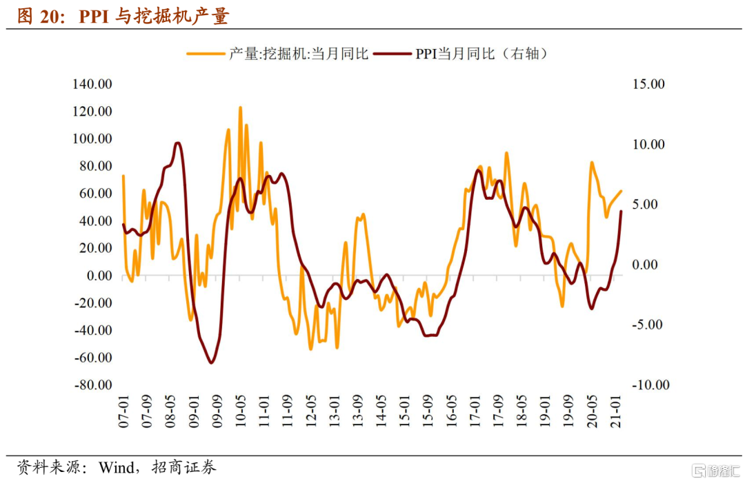 图20:PPI上行对应挖掘机产销上行。房地产开发投资具有“兴工动料”属性,不仅带动建筑材料价格上涨,对应PPI上行,还带动建筑机械如挖掘机等的产销走旺。