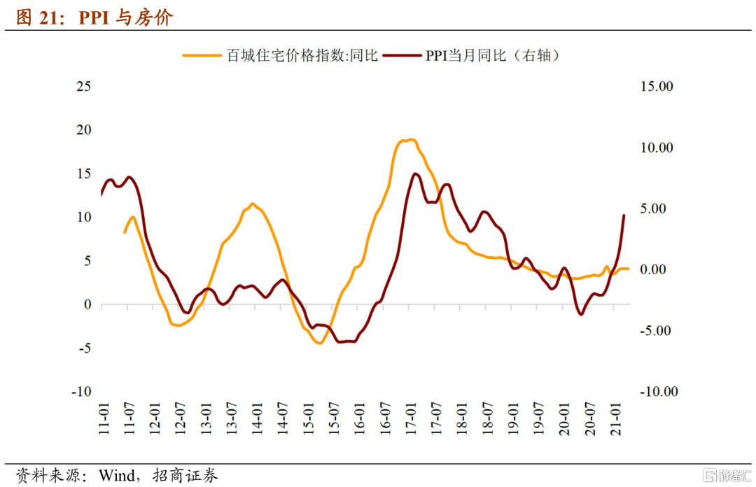 图19:PPI上行对应商品房销售上行。宽松环境下,居民杠杆进入房地产市场,大量的销售款刺激开发商扩大房地产开发投资,由此带动材料价格PPI上行。因此,历史上PPI与房地产周期密切相关,PPI上行往往对应着房地产周期上行。