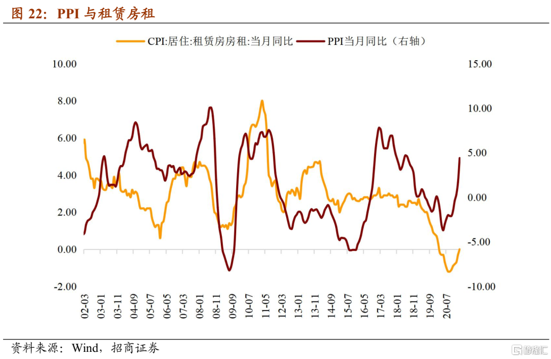 图22:PPI上行对应租房房租上行。在房地产市场回暖的环境下,不仅房价回升,连带房租也出现回升。以CPI居住统计项中的“租赁房房租”作为标尺,房租自19年以后持续下行,直到20年Q3触底回升。