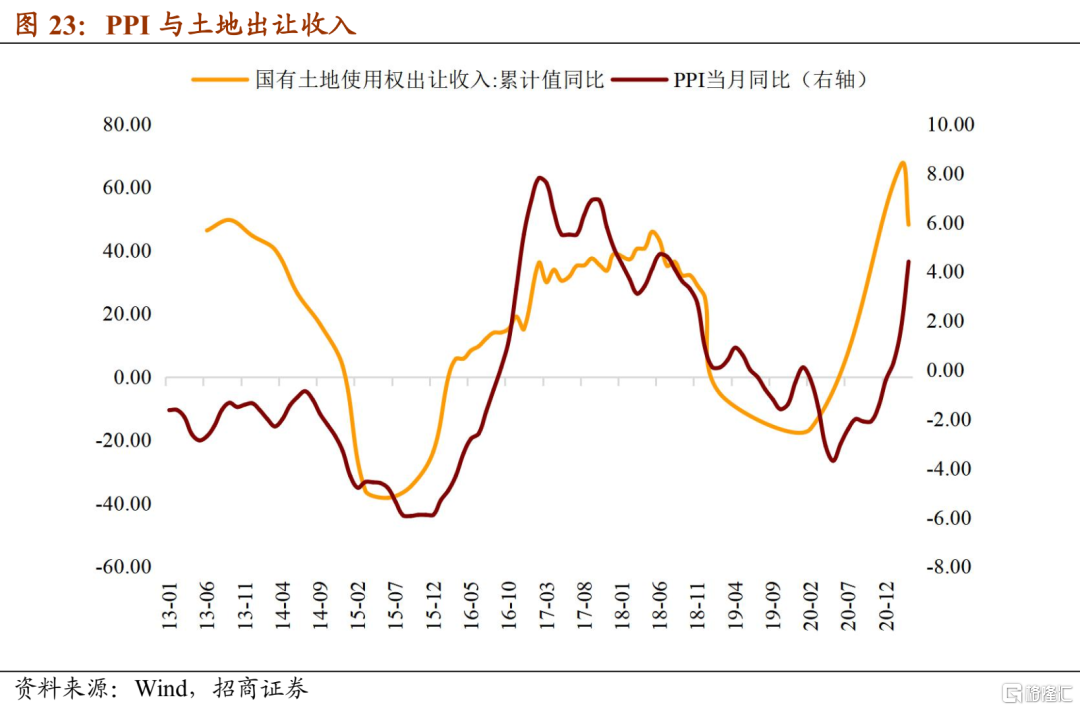 图23:PPI与地方政府土地出让收入走势一致。长期以来,土地收入一直是地方政府财政收入的一项重要来源,由此衍生出一种“土地财政”模式。在宽松环境下,房地产销售上行,卖地收入使得地方财政大幅改善。
