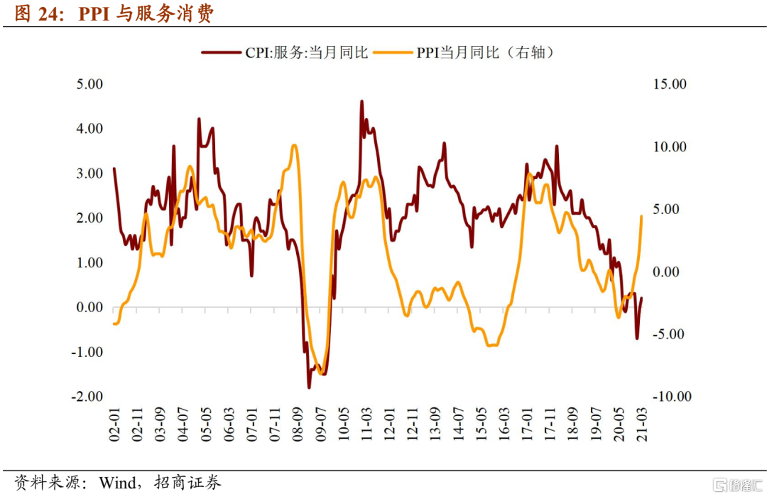 图24:PPI与服务消费走势一致。PPI与核心CPI,尤其是与核心CPI中的服务价格,长期以来保持走势一致。除了传统解释以外,还可能与地产带来的“财富效应”有关。这里的“财富效应”指的是由资产(例如房地产作为不动产)价格上涨带来的可支配收入增长,进而会使得居民服务消费需求上升,服务价格上涨。当然,20年以来疫情环境下要求保持社交距离,否则以地产和PPI走势作为参考,服务价格涨幅不会明显落后。
