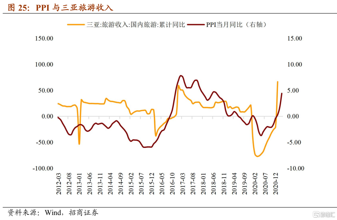 图25:PPI与三亚旅游收入走势一致。同样围绕“财富效应”逻辑,可以看到,对应地产周期的PPI与三亚旅游收入走势一致。