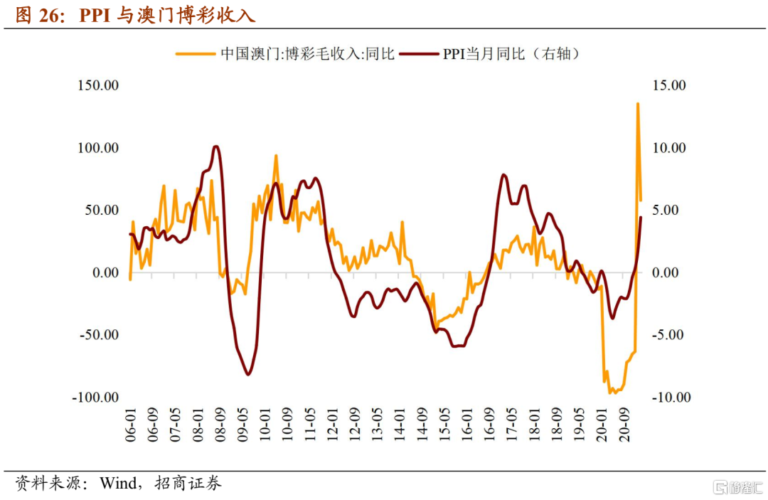 图26:PPI与澳门博彩收入走势一致。同样围绕“财富效应”逻辑,可以看到,对应地产周期的PPI与澳门博彩收入走势一致。