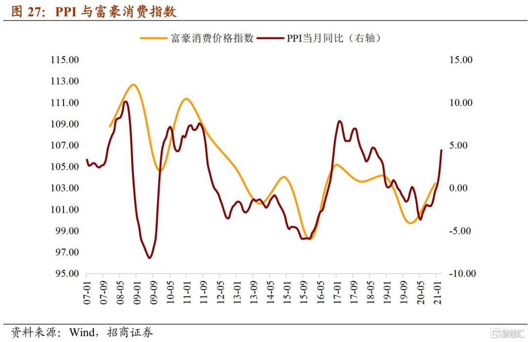 图26:PPI与富豪消费指数走势一致。财富效应对高端消费有明显促进作用。