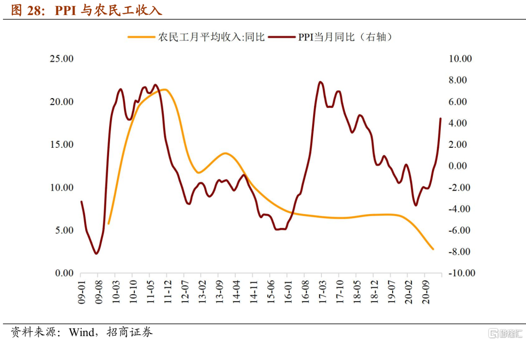 图27:PPI与农民工收入在过去一轮上涨中“脱钩”。值得关注的是,以往PPI上涨与农民工收入上涨保持一致,即农民工个人收入增长依赖于制造业和建筑业利润增长。然而过去一轮始于16年的PPI涨跌并未使得农民工收入跟随变化,且20年PPI回升的同时农民工收入反而下跌。一边是“财富效应”,一边是“收入脱钩”,这可能也是16年以来基尼系数反弹走高的一个原因。