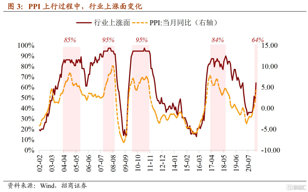 图3-4:PPI行业上涨面仍在扩大过程中,目前为64%,与前四次顶部(85%、95%、95%、84%)相比偏低。随着PPI增速上行,PPI行业上涨面(即PPI正增长的行业数量占比)也会扩大,且二者的不同之处在于,PPI增速的顶部为“尖顶”,即PPI触及高点之后立即回落,而行业上涨面的顶部为“平顶”,即上涨面会在8-9成左右维持1-2年时间。2002年以来,PPI增速的四次顶部分别出现在04年10月、08年8月、10年5月和17年2月,对应行业上涨面顶部均值分别为85%、95%、95%、84%。换言之,当PPI增速的顶部附近,总能看到几乎8-9成的行业价格上涨,接近“全面上涨”局面,否则难言结束。对比之下,截至2021年3月,行业上涨面为64%,距离8-9成仍有一段距离。