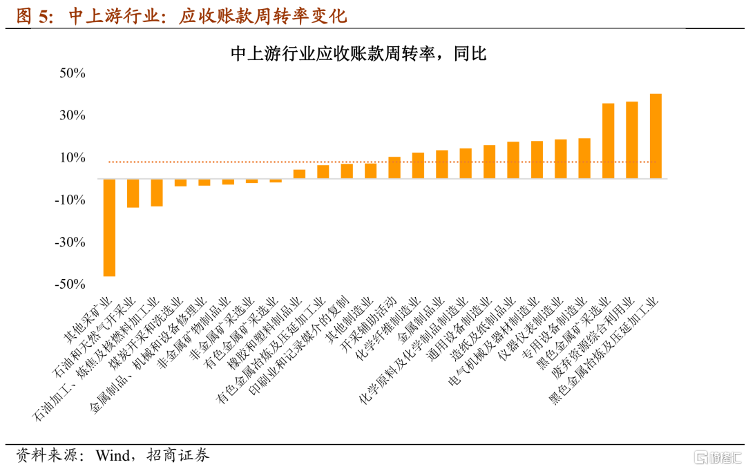图5-6:工业企业议价能力(以应收账款周转率为标尺)仍处于底部回升过程中,有利于中上游行业价格继续向下游传导。价格能否顺利转嫁,一个考察指标是工业企业议价能力高低。我们用应收账款周转率作为标尺,截至2021年3月,工业企业议价能力继续底部回升,有利于价格继续转嫁。且分行业看,中上游议价能力较去年底改善更多(具体地,改善最为明显的行业主要是黑色金属),这意味着,现阶段的传导主要是PPI中上游行业向PPI下游行业的传导;下游议价能力较去年改善偏少(具体地,改善最为明显的行业是汽车制造业),这意味着,现阶段PPI下游行业向CPI的传导仍然相对有限。