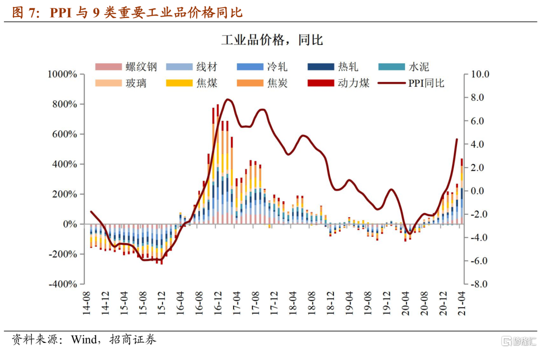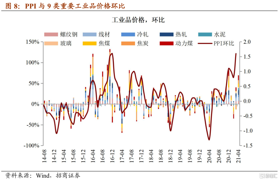 图7-8:选择9种工业品“定制”价格指数。成熟的价格指数动辄包括上千种工业品种类,而“定制”的目的在于更为清楚的分出价格涨跌主要是由哪些工业品驱动的。例如,我们选择钢铁、水泥、玻璃、煤炭等9种工业品,其价格同比(环比)合计涨幅与PPI同比(环比)具有较高的相关性。