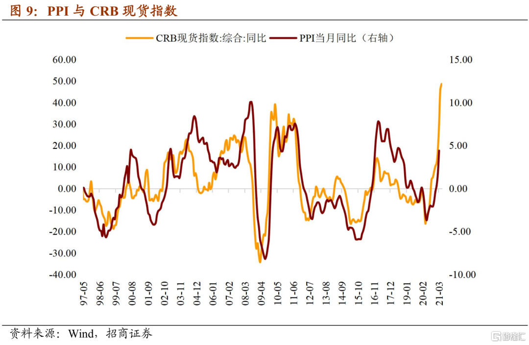 图9:PPI与CRB现货指数。CRB现货指数是美国商品调查局发布的日频数据。是基于美国现货市场的商品价格指数,依据22种基本的经济敏感商品的价格编制的。综合指数之下有6个子指数:金属、纺织品和纤维、牲畜及产品、脂肪和油类、工业原料、食品物料。