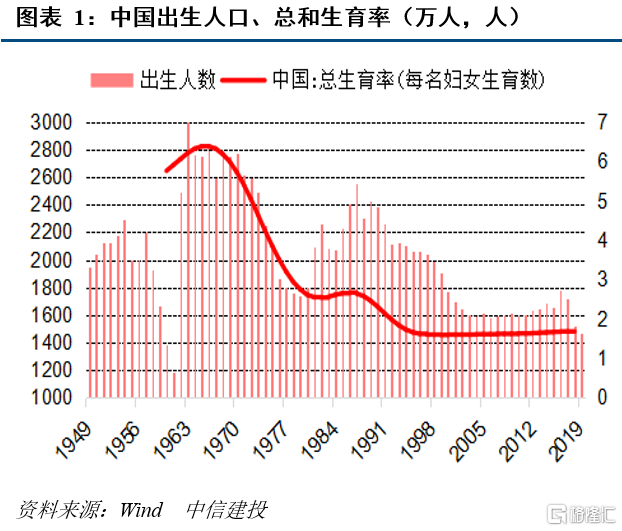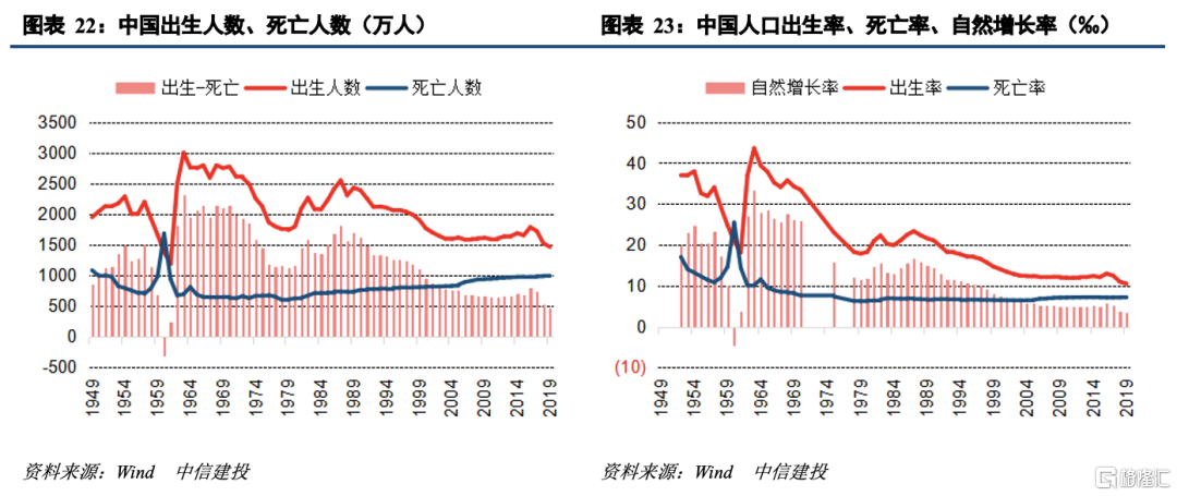 少子化带动人口总量将在2027年或者更早迎来拐点。2018-2019年随出生人数的减少,我国人口净增量、自然增长率明显下滑,未来几年出生人口规模加快减少将使我国距离人口拐点越来越近。2019年我国人口14.05亿,根据中国人口与发展研究中心2020年底的预测,中国总人口将在2027年达到峰值14.17亿,而后进入负增长,2035年降至14.03亿,2050年降至13.21亿。而根据中国社会科学院副院长蔡昉估计,“十四五”期间有可能提前迎来人口的峰值和负增长。