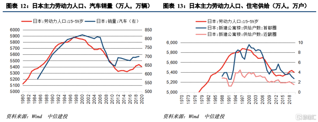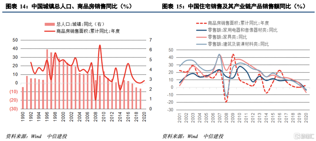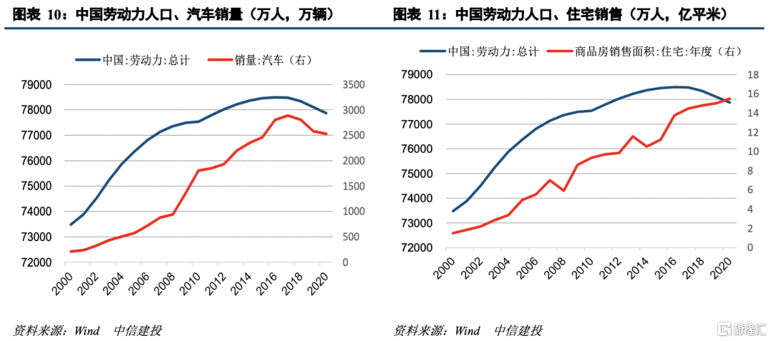 劳动力加速下滑,房、车、家电等大宗消费增长受限。劳动力是劳动年龄人口中符合特定定义的劳动群体,其变化和劳动年龄人口走势基本一致。劳动力是大宗消费的主力,从日本的经验来看,在15-59岁的主力劳动人群数量于1997年见顶后,日本的汽车、住房销量也基本先后见顶。我国劳动力数量在2017年见顶,同时我国汽车销量也于2017年见顶,与日本经验一致。但我国商品房销售面积并未见顶,这与我国处于城镇化率持续提升的过程中有关,我国的商品房销售面积增速与城镇人口增速较为一致,当前城镇人口增速逐年放缓,因此商品房销售虽未见顶但增速也在放缓,相应的地产产业链相关大宗消费品如家电、家具、家装建材增速也在同步放缓。