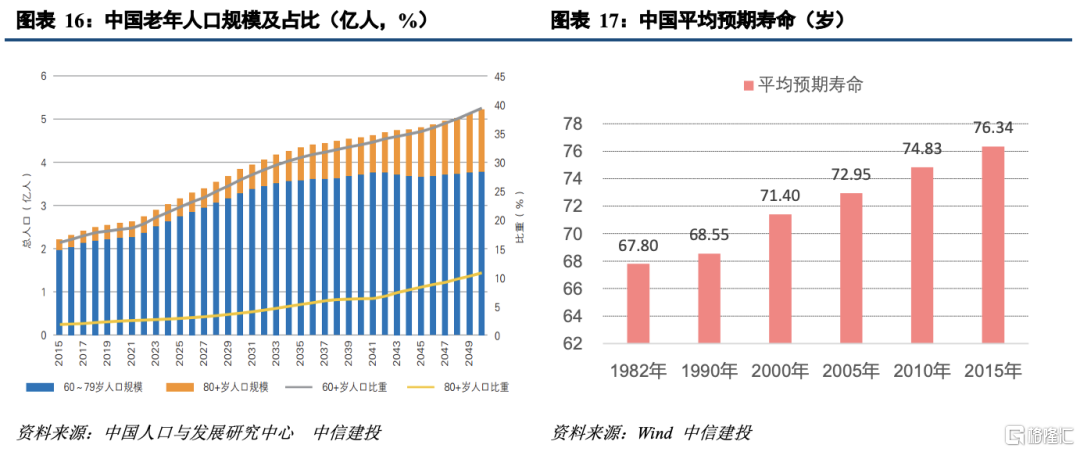 根据中国人口与发展研究中心预测,受60年代出生高峰期人口进入老年阶段的影响,“十四五”时期60岁以上老年人将由2020年的2.54亿增至2025年的3.16亿,年均增加1150万(“十三五”年均740万),2032年突破4亿,2048年突破5亿。如果按联合国标准,我国于2002年65岁人口占比超过7%,已进入老龄化社会,预计2022年65岁人口占比超过14%,进入深度老龄化社会。