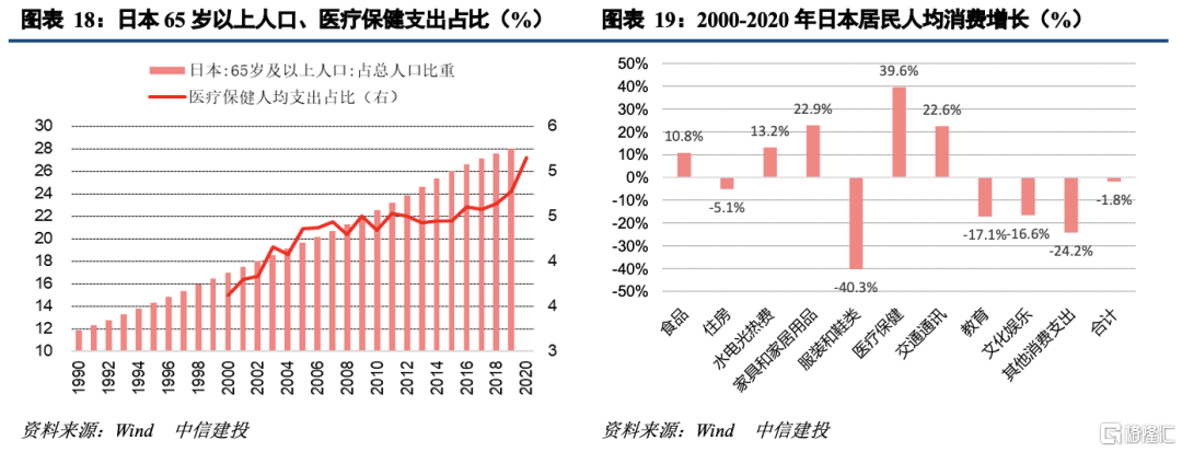 老龄化加速,医疗保健消费将迎高增长。按联合国标准,我国于2002年65岁人口占比超过7%,已进入老龄化社会,预计2022年65岁人口占比超过14%,进入深度老龄化社会。“十四五”时期我国60岁以上老年人将由2020年的2.54亿增至2025年的3.16亿,年均增加1150万(“十三五”年均增加740万),老龄化加速将带动医疗保健(器具、药品、服务)相关消费将迎高增长。从历史数据看,不论日本还是我国,由于老龄化持续提升,医疗保健相关消费是各类消费支出中增速最快的领域。