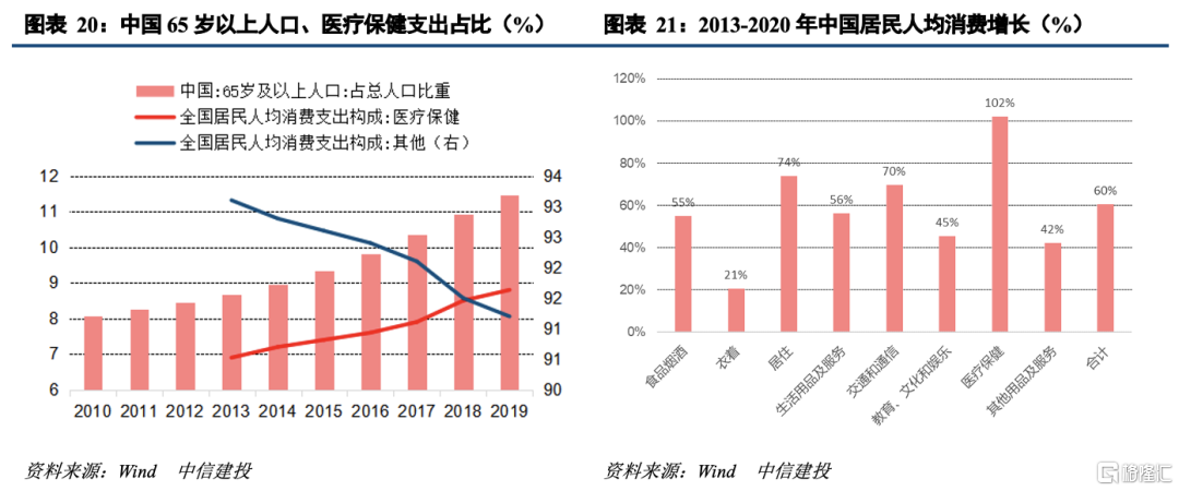 老龄化加速,医疗保健(器具、药品、服务)相关消费将迎高增长。2000-2020年,日本家庭人均消费支出下降1.8%,而人均医疗保健消费支出大幅增长39.6%,也是各类消费支出中增速最快的领域,占人均消费支出的比重也由3.6%上升至5.1%。我国的医疗保健消费增长情况与日本经验相似,2013-2020年,我国人均消费支出增长60%,人均医疗保健消费支出增长102%,也是增长最快的方向,占人均消费的比重由6.9%上升至8.8%。“十四五”时期我国老龄化进一步加速,医疗保健领域消费将迎更高增长。