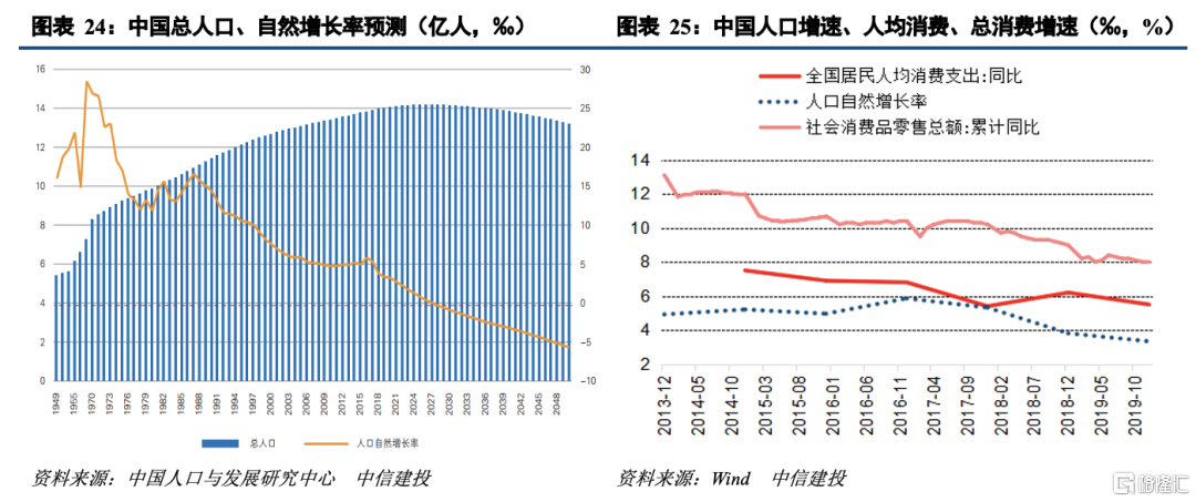 人口总量迎拐点,消费总量增速趋缓。根据中国人口与发展研究中心预测,中国总人口将在2027年达到峰值14.17亿,而后进入负增长。而根据中国社会科学院原副院长、央行货币政策委员会委员蔡昉估计,“十四五”期间有可能提前迎来人口的峰值和负增长。一国总消费增速由人口增速和人均消费增速共同决定。我国2015-2016年人均消费增速小幅回落,但由于人口自然增长率小幅上行,因此社零总额的增速并未明显下滑,保持在10%以上。而2016年后,人均消费增速回落叠加人口增速下滑,社零总额增速回落明显,由10%以上回落至8%左右。“十四五”期间我国人口自然增长率进一步下行,将带动消费总量增速进一步放缓。