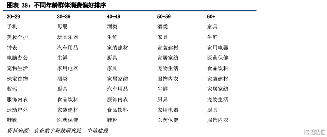除少子化、老龄化趋势外,中间年龄群体内部结构的变化对消费亦有重要影响。根据当前我国人口结构,我们可推算五年后、十年后的人口结构变化情况,结果显示,除了低龄群体数量下滑、高龄群体数量增加较为确定外,中间年龄群体的变化有分化。20-29岁群体数量未来五年、十年下滑明显,30-59岁之间的群体在五年后和十年后的变化方向不同。不同年龄层次的群体消费需求和偏好有明显区别,因此各年龄层次群体数量的变化也将对消费产业产生影响。根据京东数字科技研究院《代际用户消费洞察报告》数据,20-29岁群体主要消费需求及消费偏好与其他年龄群体差别较大,主要为手机、美妆个护、钟表、电脑、宠物等,未来五年、十年这个年龄层群体数量趋势性的下滑也将影响相关品类的消费增速。