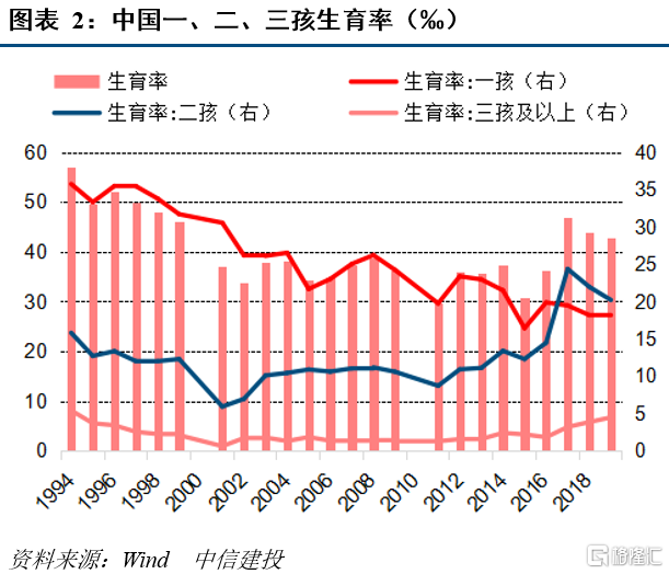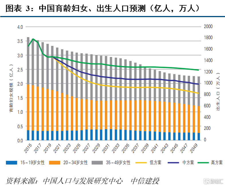 主力育龄妇女规模加快下行,生育率低位徘徊,“20后”群体规模将加快收缩。根据中国人口与发展研究中心数据,我国20-34岁主力育龄妇女规模“十三五”时期年均减少340万,“十四五”时期将开始加速下降,从2020年的1.45亿降至2025年的1.14亿,年均减少620万人左右。受2015年全面放开二孩生育政策影响,“十三五”时期我国出生人口规模出现短暂的提高,主要是二孩和三孩生育率短暂走高,近年在一孩和二孩生育率持续回落的带动下,出生人口再次快速回落。“十四五”时期是出生人口规模减少最为快速的时期,中方案预测每年减少近50万。