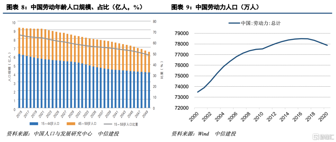 “十三五”时期我国15~59岁劳动年龄人口规模平缓下降,平均每年减少280万人,从“十四五”起降幅将开始提速。根据中国人口与发展研究中心预测,我国劳动年龄人口规模将从2020年的9.11亿降至2025年的8.76亿,年均减少697万,远超“十三五”时期,至2035年将降到7.94亿,2050年降到6.44亿。