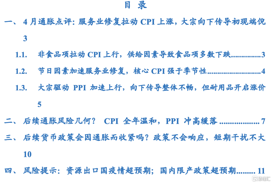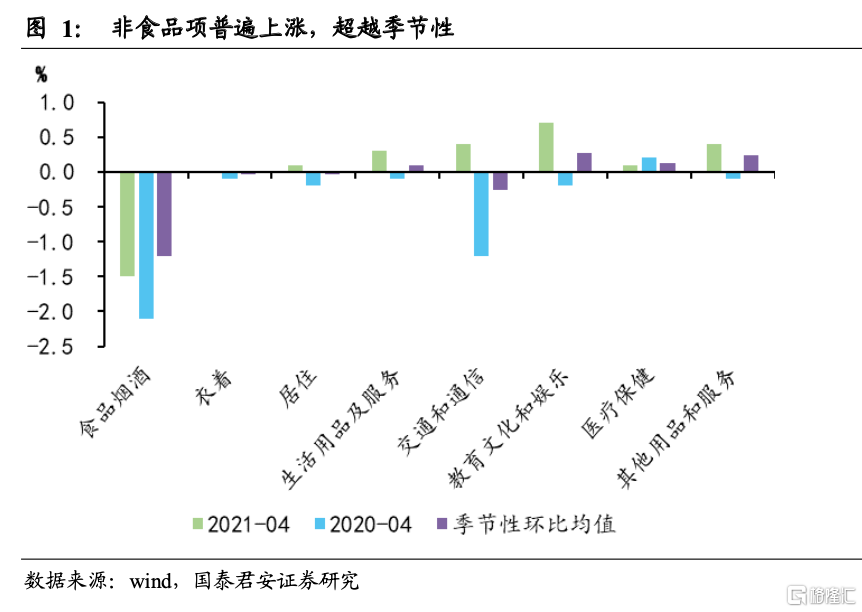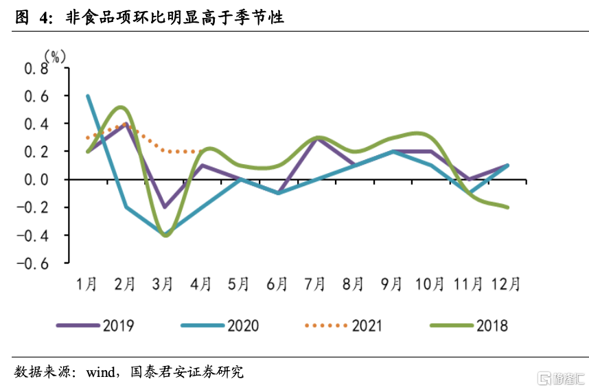 2. 非食品项是拉动CPI回升主因,一是节日因素加速服务业恢复,二是原材料涨价向耐用消费品传导,4月非食品项对CPI贡献超100%;