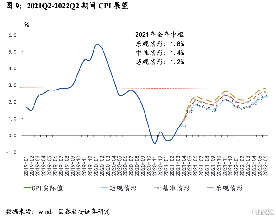 我们综合考虑了能源价格走势和猪周期趋势,以不同的生猪价格和石油(WTI)价格为不同情形假设,对2021Q2-2022Q2期间CPI进行展望: