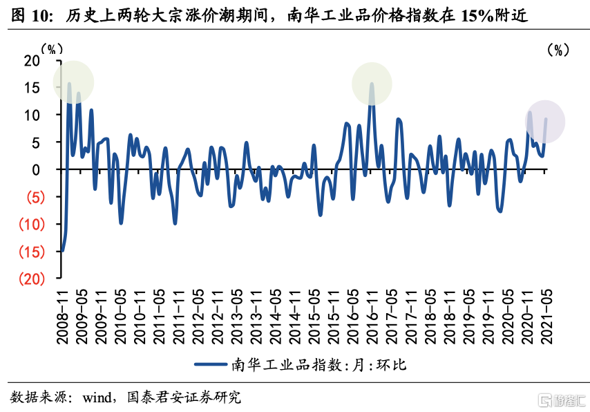 在预测中,三季度翘尾向下与大宗持续涨价,是PPI下行和上行的两大相互对冲的力量。在我们利用南华工业品指数进行建模分析时,发现当前环比涨幅速度已经接近历史高位至9%(历史峰值在15%附近)。我们进而参照了历史上两轮大宗涨价潮的环比幅度进行了乐观、基准、悲观三种情形的预测。在预测中我们发现,由于环比增速幅度可能超过历史峰值,并且具有一定持续性,因而PPI三季度回落幅度较小,有再度冲高的担忧。